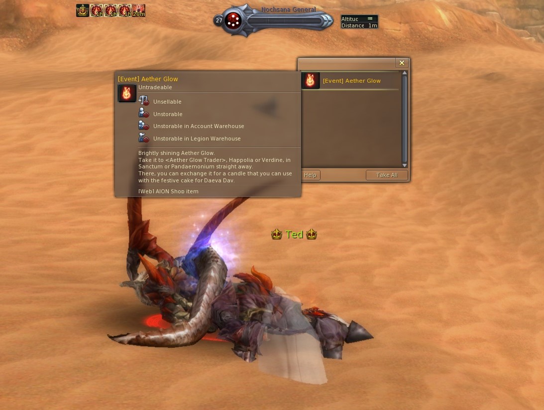 Mas tenha cuidado! A Aether Flame se apagará em 2 horas após ser coletada. Por se tratar de um elemento muito poderoso, cada Daeva poderá carregar apenas 01 Aether Flame por vez. Você deverá troca-la antes desse tempo por um desses itens incríveis: